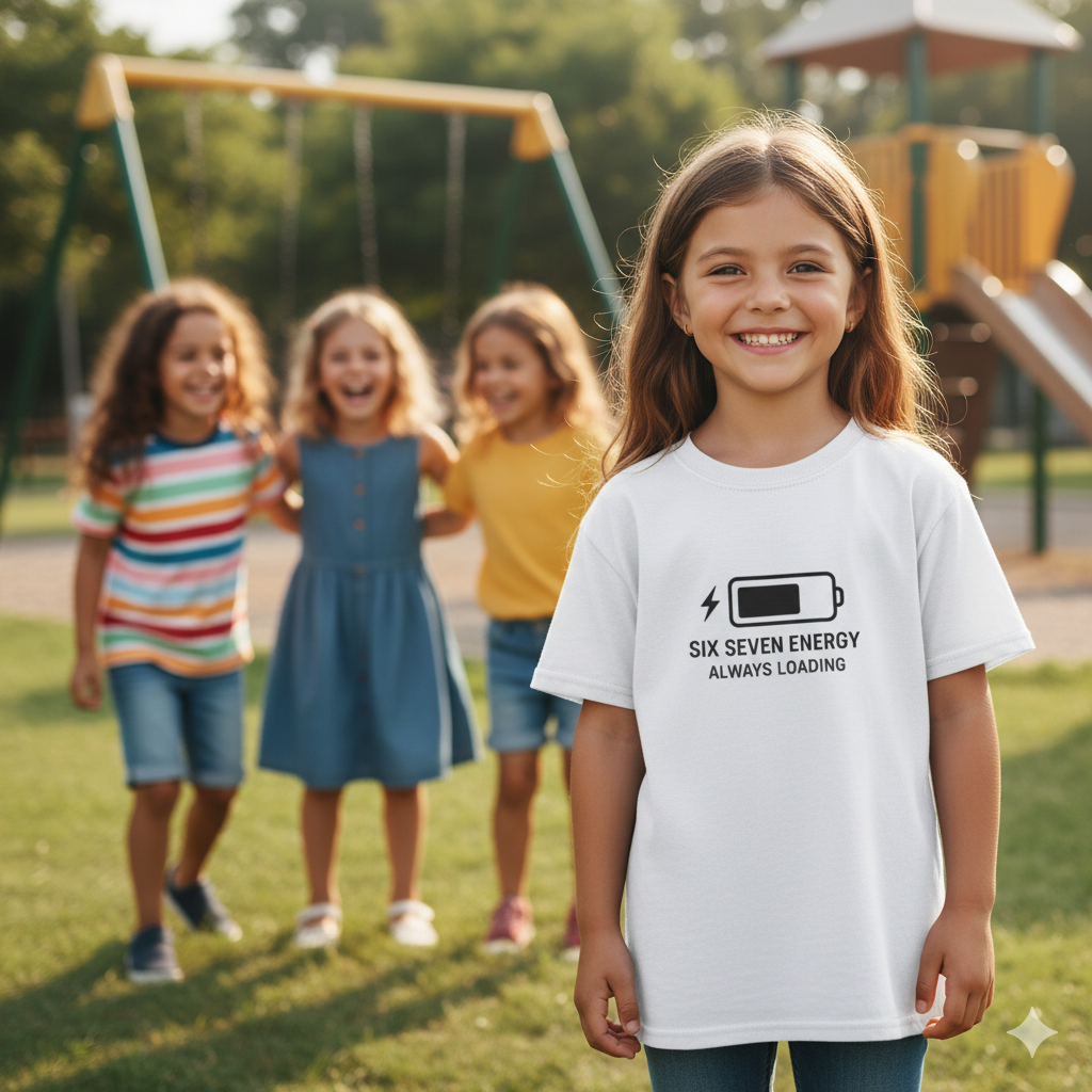 A fun and playful tee featuring the popular six seven meme Battery Loading design. Perfect for kids who love trendy and humorous graphics. Ideal for casual wear, play dates, and birthday parties.