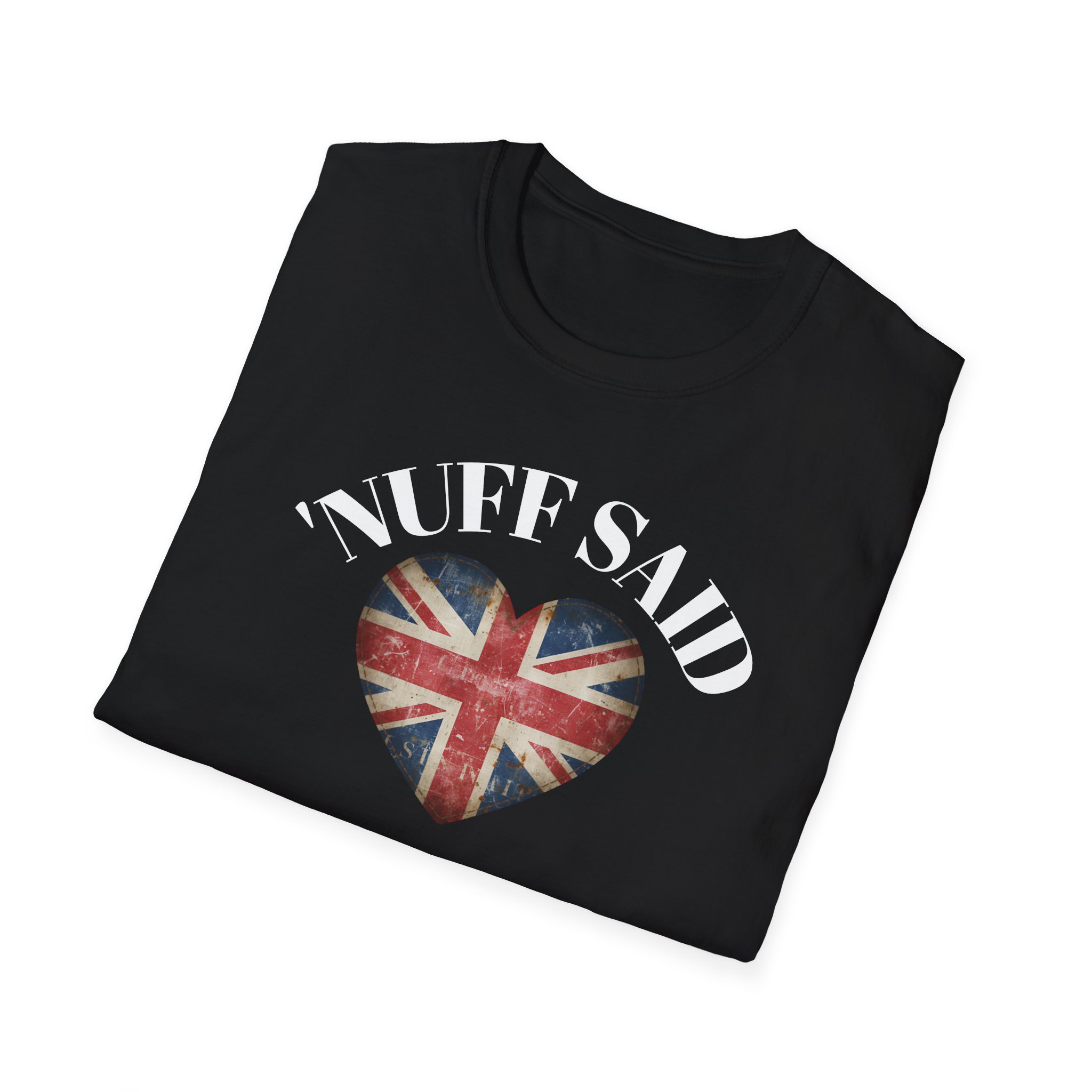 Whether you're a fan of British culture or just love unique and striking graphic tees, this design is sure to make a statement. With the heart-shaped Union Jack and the trendy "NUFF" SAID text, it's a must-have addition to your wardrobe.
